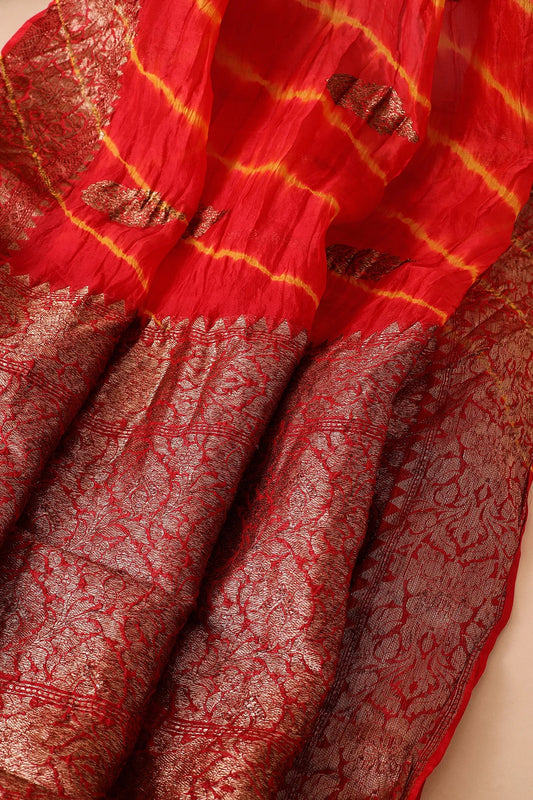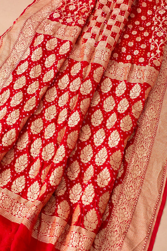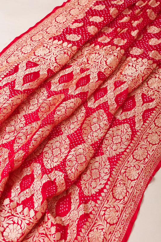 Crimson Red Zari Woven Bandhani Organza Saree