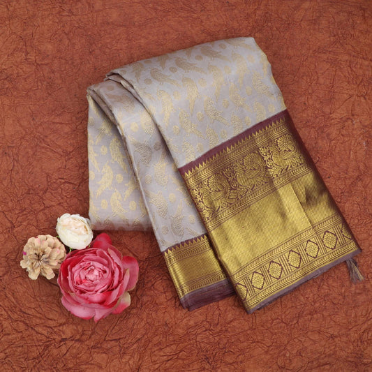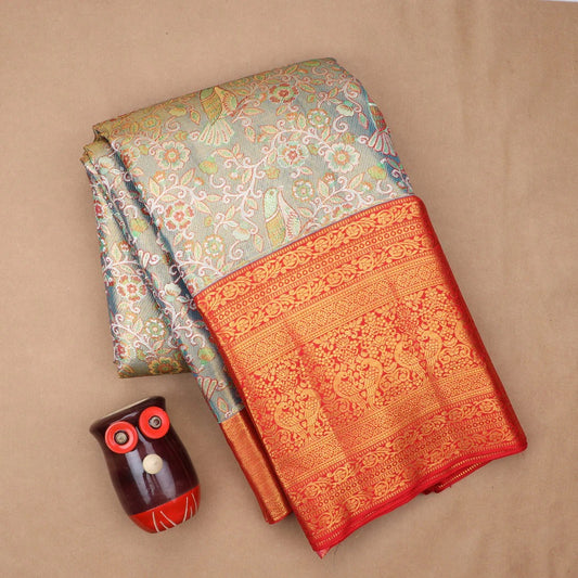 Bluish Grey Tissue Kanjivaram Silk Saree With Floral And Bird Pattern