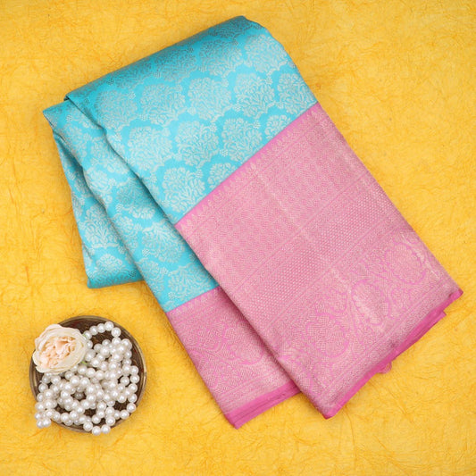 Bright Blue Kanjivaram Silk Saree With Floral Motif Pattern