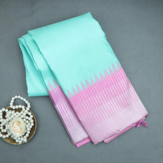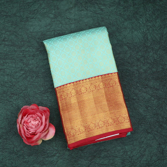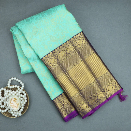 Seafoam Blue Kanjivaram Silk Saree With Floral And Bird Pattern