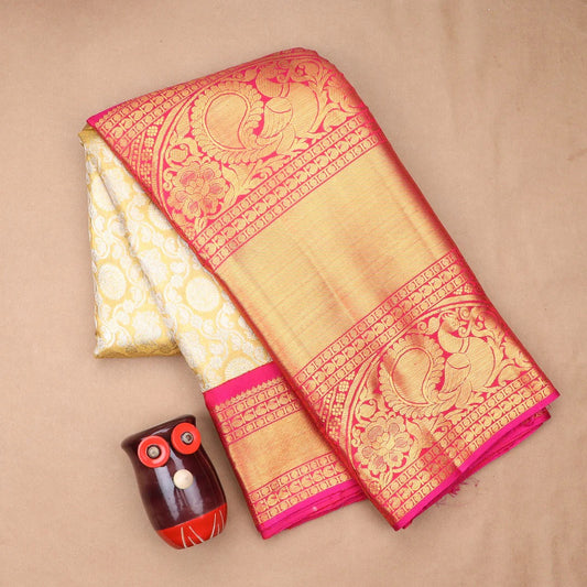 Golden Yellow Tissue Kanjivaram Silk Saree With Floral And Mayil Pattern