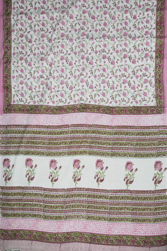 Pink Floral on Cream Sanganeri Mul Cotton saree