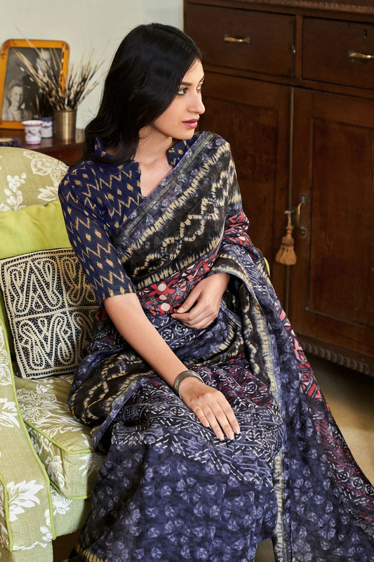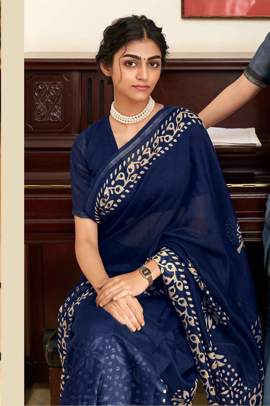 DENIM BLUE HANDLOOM PRINTED ZARI COTTON SAREE