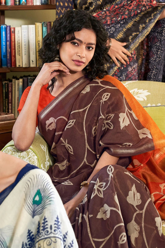 CARAMEL BROWN HANDLOOM PRINTED ZARI COTTON SAREE