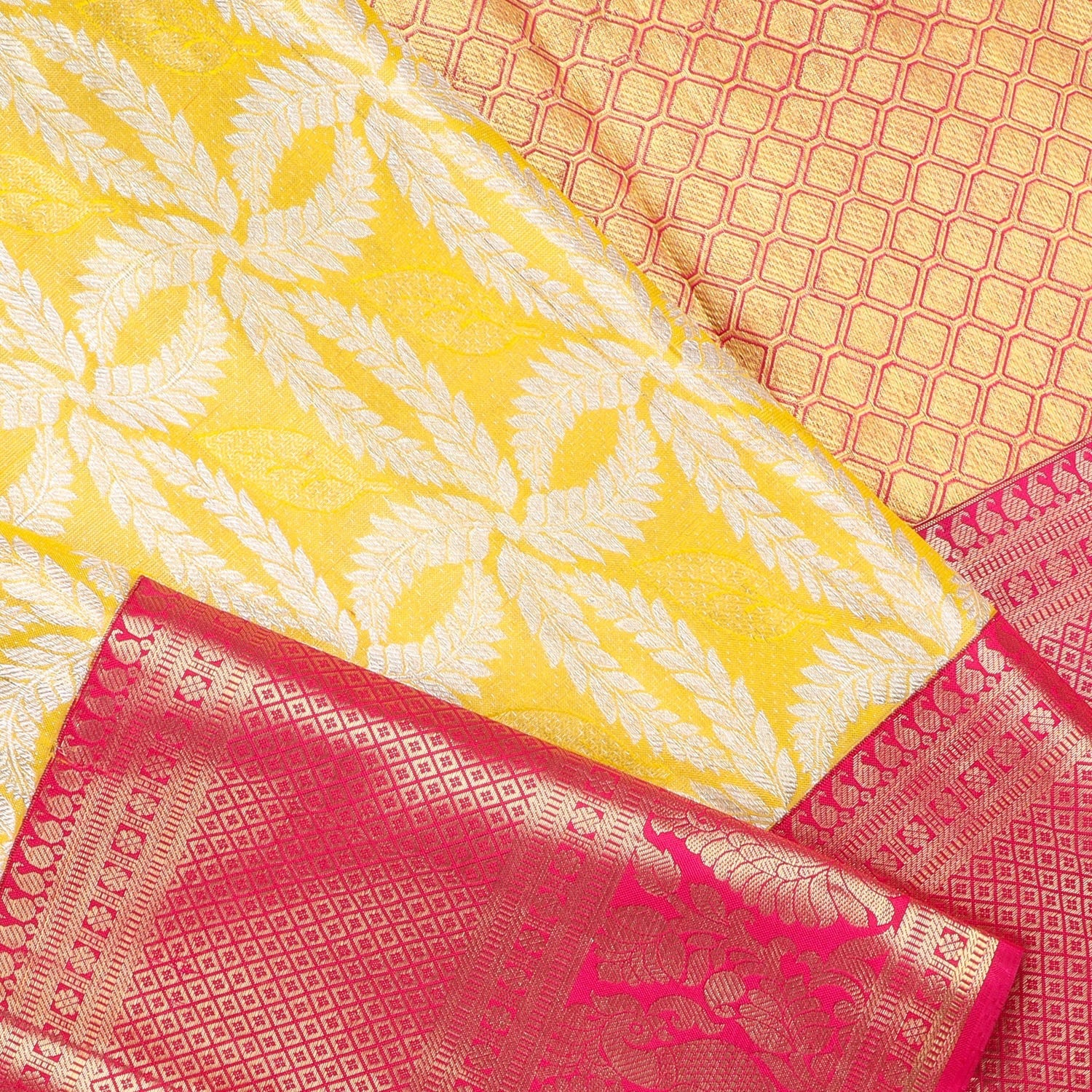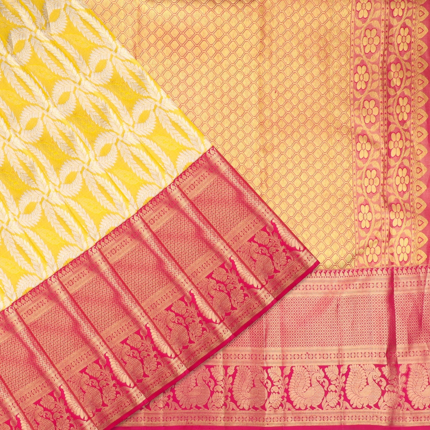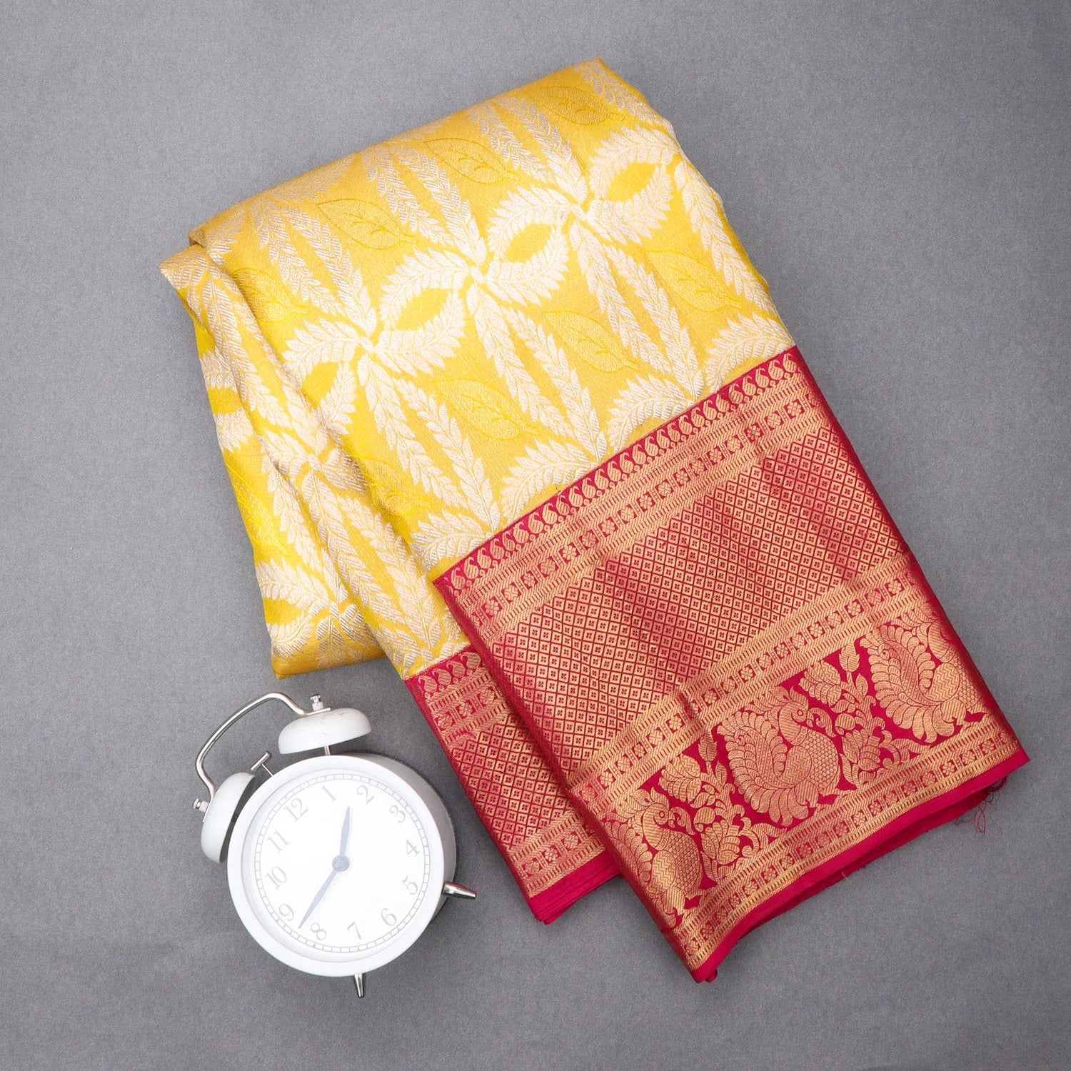 Bright Yellow Kanjivaram Silk Saree With Floral Pattern