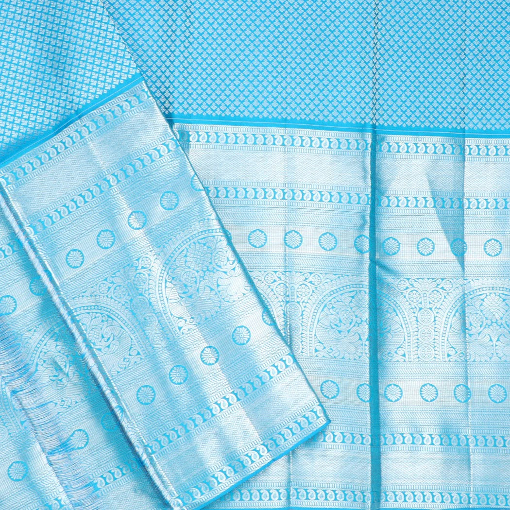 The suave elegance of this exquisite Light green kanjivaram silk saree with floral motifs, where it accentuated with contrast blue and gleaming silver zari woven border and pallu.