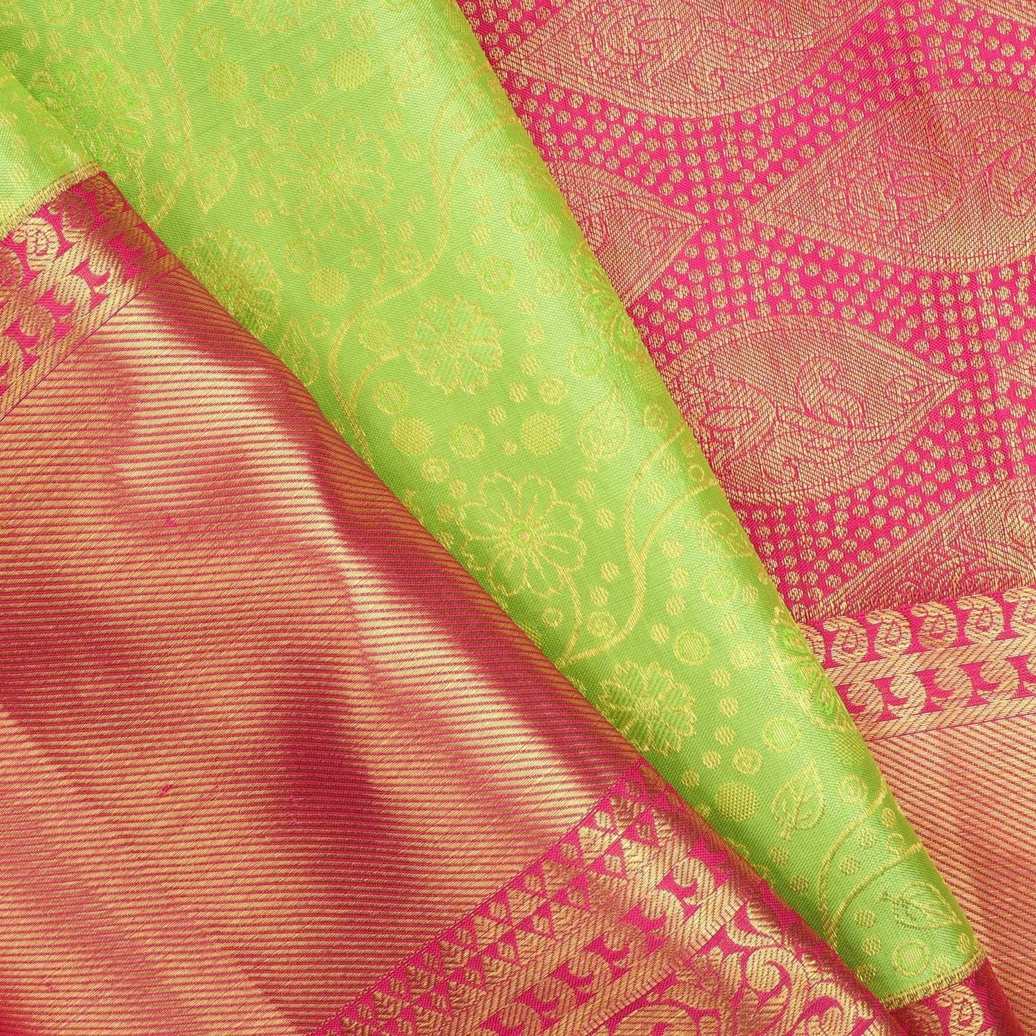 Illuminating a divine aura, this alluring Light green Kanjivaram silk saree with floral pattern, merged with contrast pink and gleaming gold zari woven border and pallu.