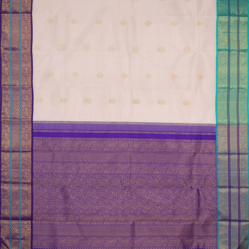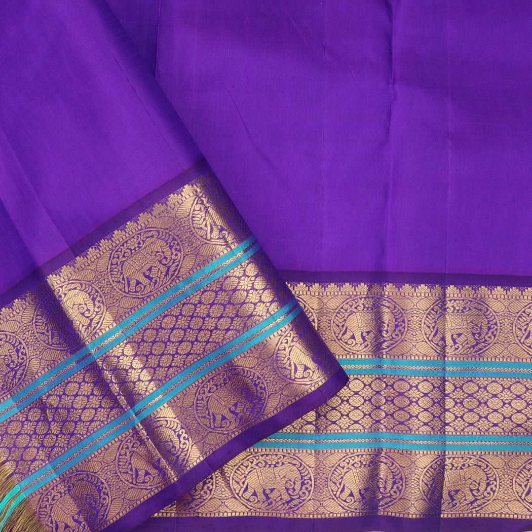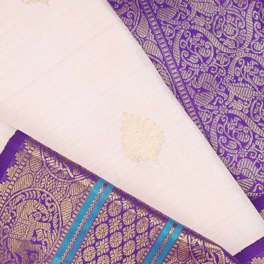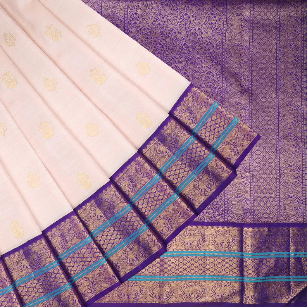 The craft that know no boundaries, this Pale pink kanjivaram silk saree with floral buttas, where it is elevated with contrast violet and gleaming gold zari woven border and pallu.