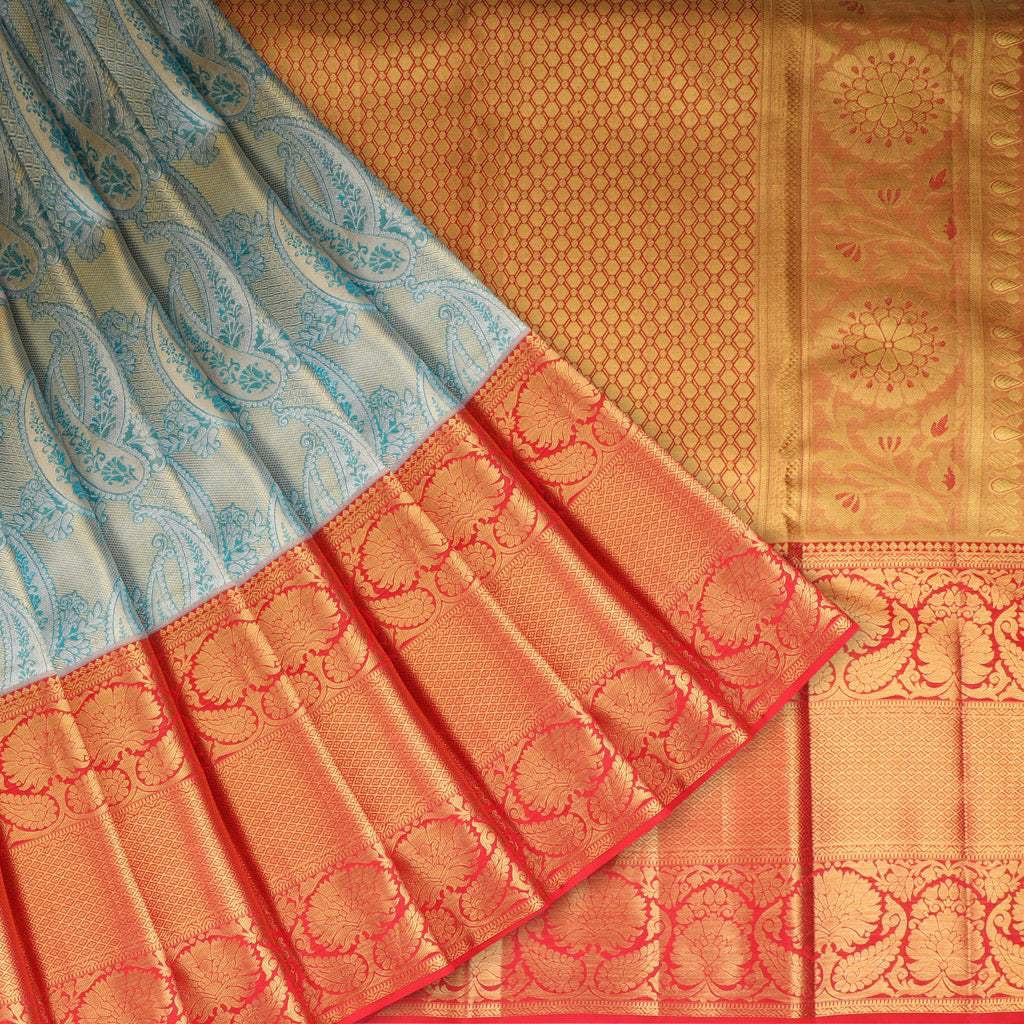 Appealing in the shade of this powder blue tissue kanjivaram silk saree with paisley motif pattern across the body, elevated with contrast red and gleaming gold zari woven floral motifs in the border and pallu.