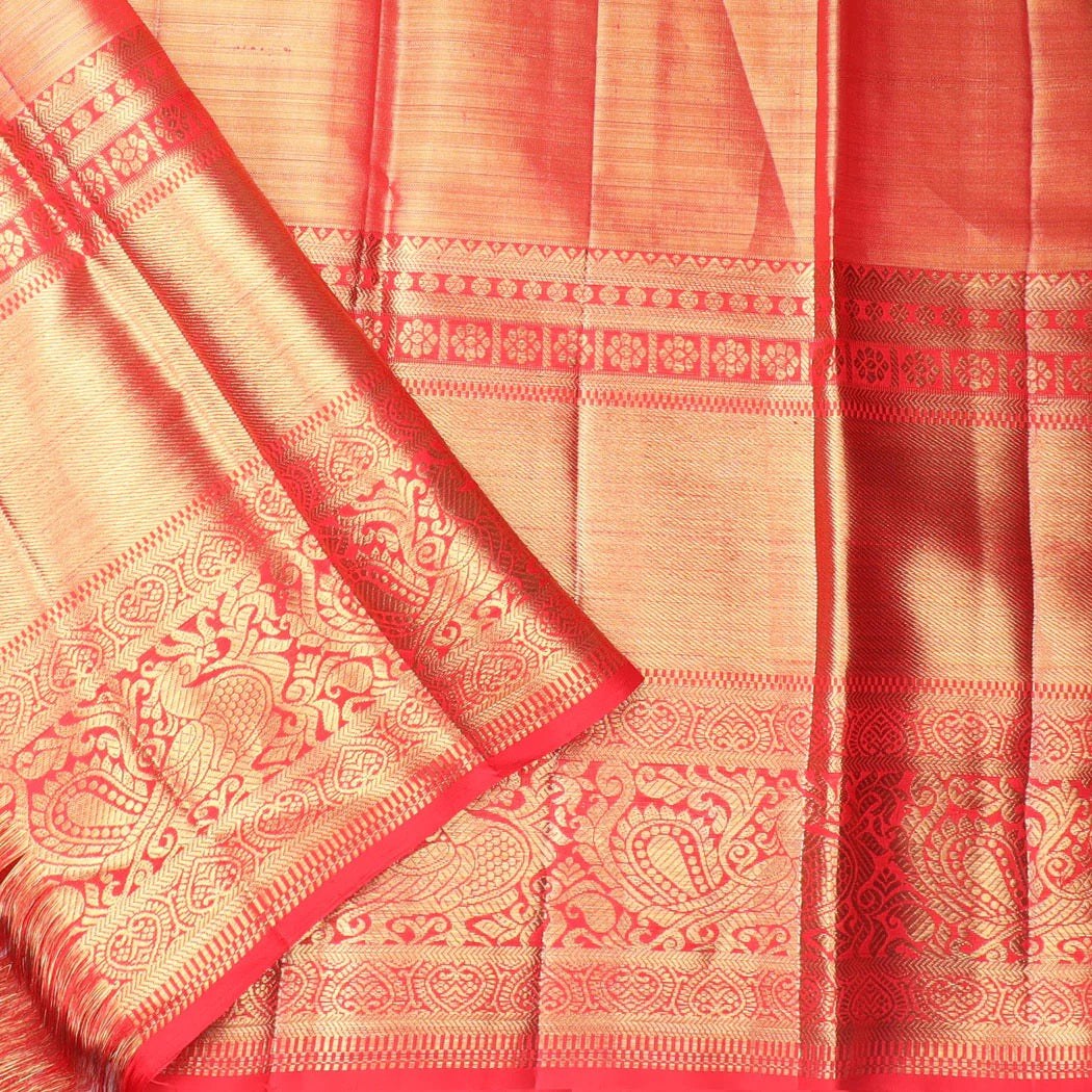 Giving an interesting look, this Violet tissue kanjivaram silk saree with floral motif pattern, merged with contrast orange and gleaming gold zari woven border and pallu.