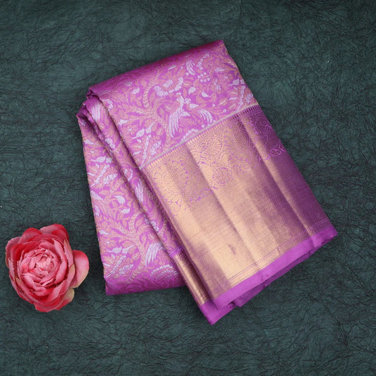 Dark Mauve Kanjivaram Silk Saree With Floral And Bird Pattern
