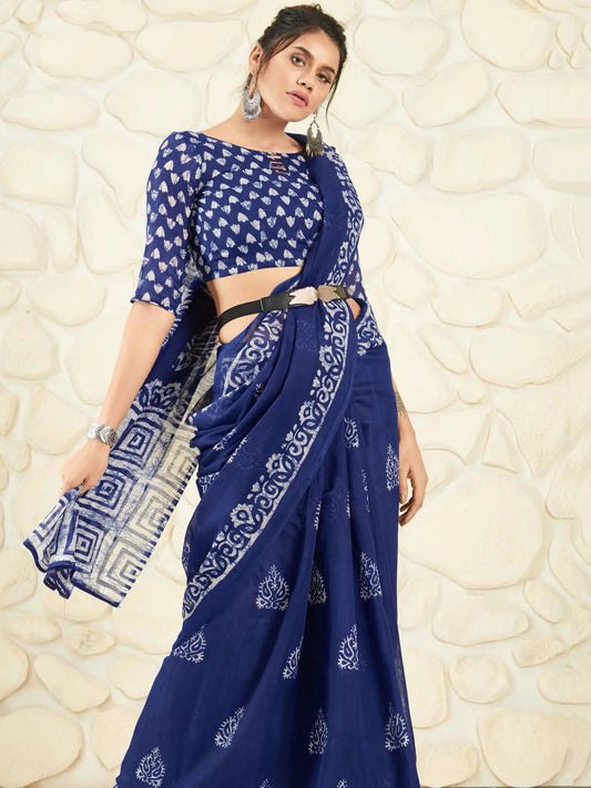 Dark Blue Ikkat Printed Cotton Saree