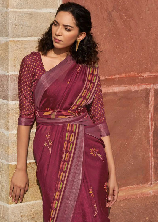 JAM MAROON BATIK PRINT PURE LINEN SAREE