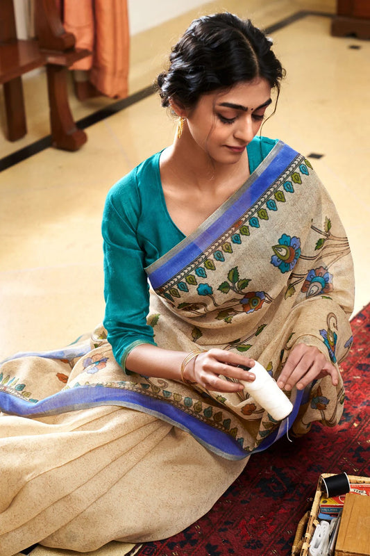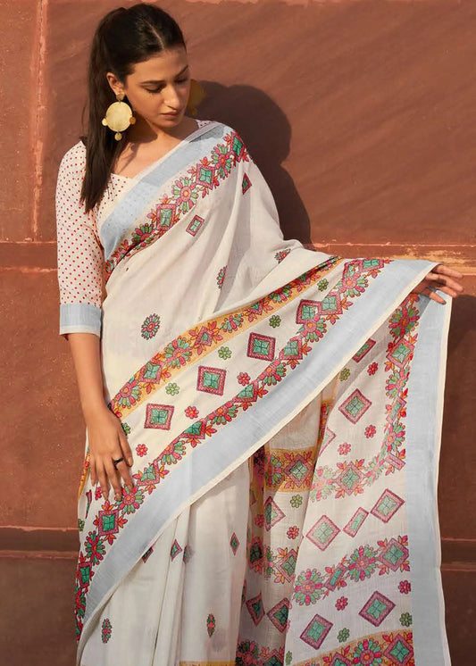 FROST CREAM BATIK PRINT PURE LINEN SAREE